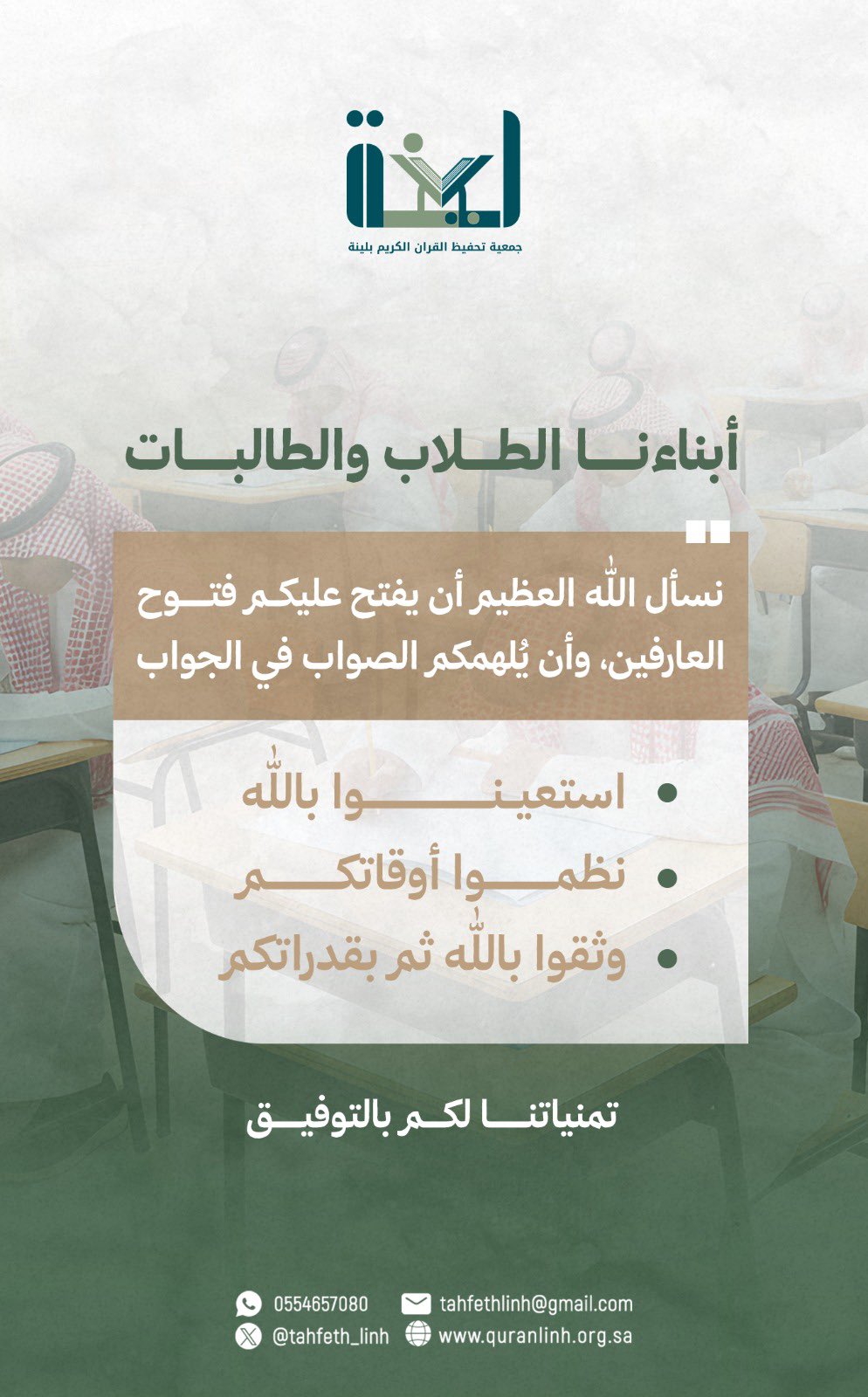 أبناءنا الطلاب والطالبات | أبناءنا الطلاب والطالبات.. قلوبنا معكم ودعواتنا ترافقكم في مسيرتكم التعليمية📚📖 نسأل الله العظيم أن يفتح عليكم فتوح العارفين، ويرزقكم السداد والصواب في الجواب🌟📚 quran linh