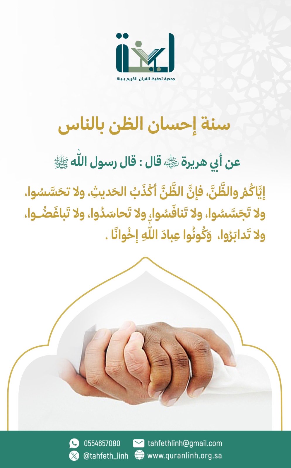 إحسان الظن | إحسان الظن أكرم نفسك بـ #إحسان_الظن بالناس🌵 وتجنّب التنافس المُهلك والتدابر القاطع، المودة أساسها الصفاء، كونوا عباد الله إخوانًا🤝 #جمعية_تحفيظ_القران_الكريم_بلينة quran linh