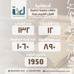 احصائية حلقات جمعية تحفيظ القرآن الكريم بلينة للفصل الدراسي الثاني لعام 1446هـ احصائية حلقات جمعية تحفيظ القرآن الكريم بلينة للفصل الدراسي الثاني لعام 1446هـ admin