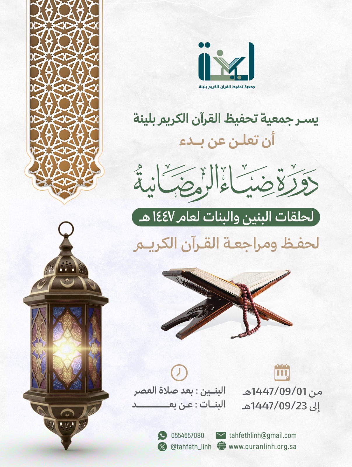 اعلان عن بدء دورة ضياء الرمضانية .. | يسر #جمعية_تحفيظ_القران_الكريم_بلينة أن تعلن عن بدء دورة #ضياء الرمضانية 📆 1447/9/1هـ ⏰ البنين: بعد صلاة العصر البنات: عن بعد quran linh