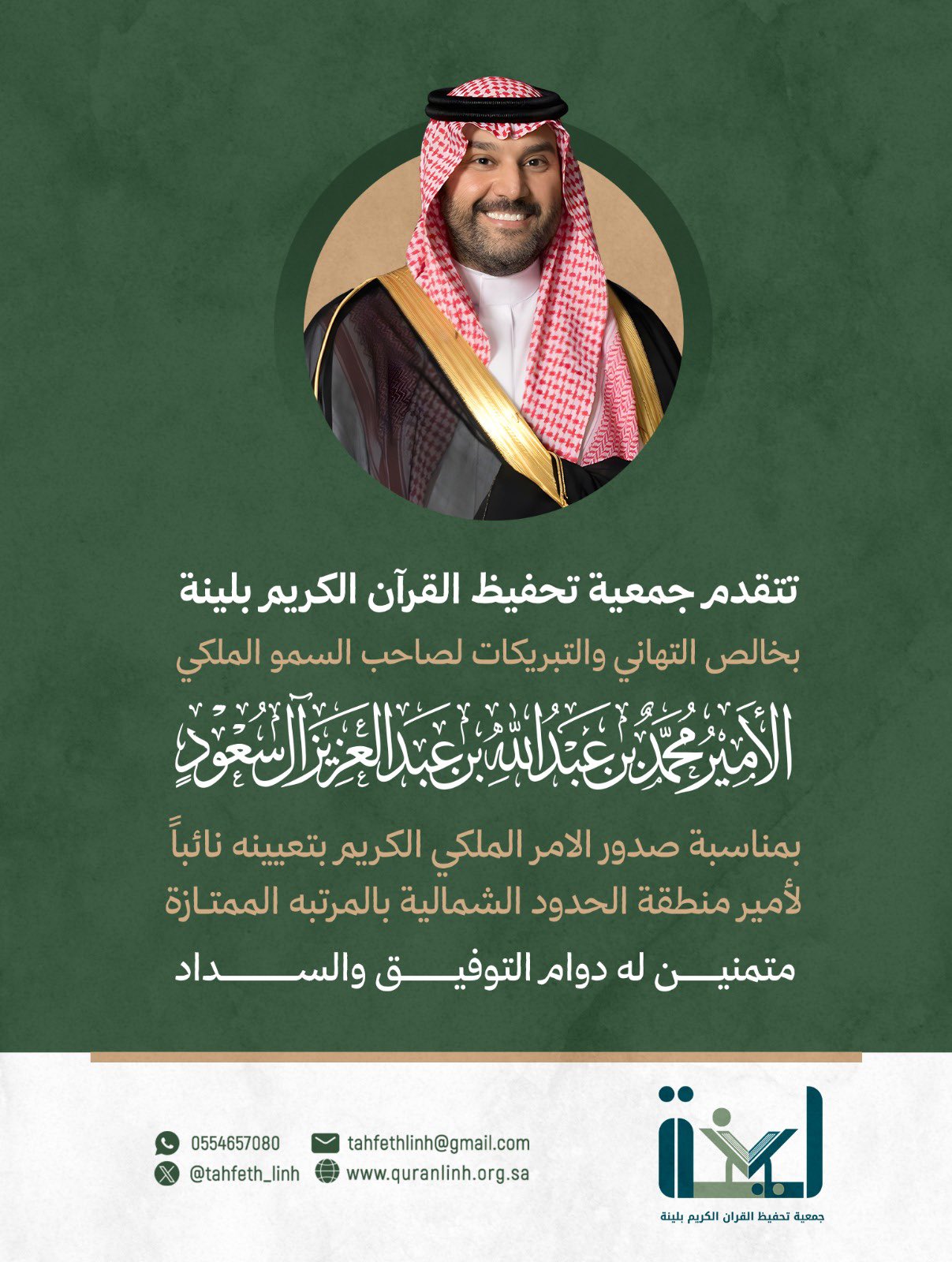 تتقدم جمعية تحفيظ القرآن الكريم بلينة بخالص التهاني والتبريكات لصاحب السمو الملكي الامير