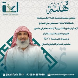 تهنئة الاستاذ/ مصطفى علي الصادق تتقدم جمعية تحفيظ القرآن الكريم بلينة بتهنئة الاستاذ/ مصطفى علي الصادق لإجتيازه الدورة التدريبية لإعداد معلم في مناهج التبيان لتعليم القرءان بالقران وحصوله على نسبة ٨٦% متمنين له دوام التوفيق والنجاح admin