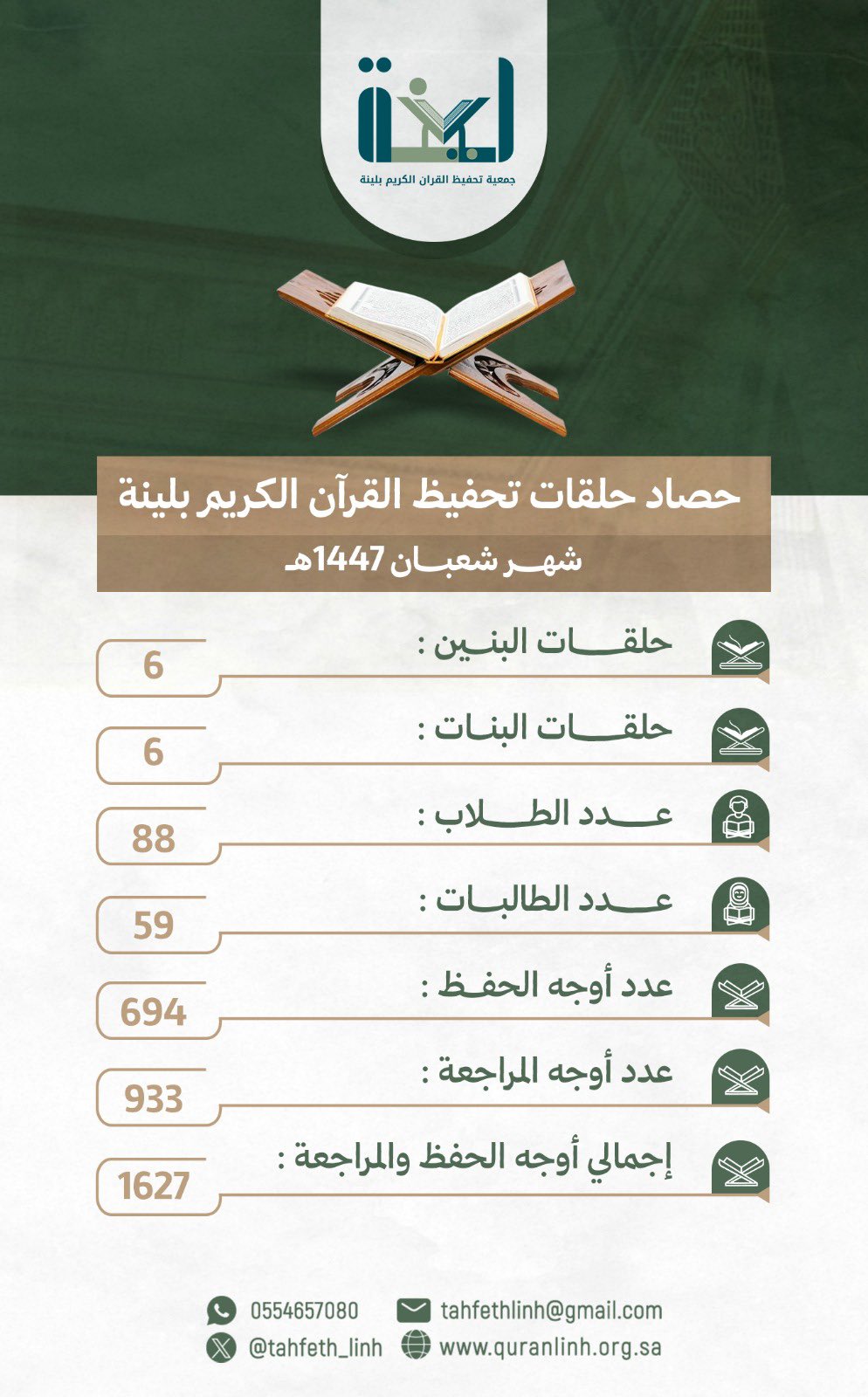 | نُعلن عن حصاد شهر شعبان المفصل لحلقات #جمعية_تحفيظ_القران_الكريم_بلينة ١٤٤٧هـ 🌙