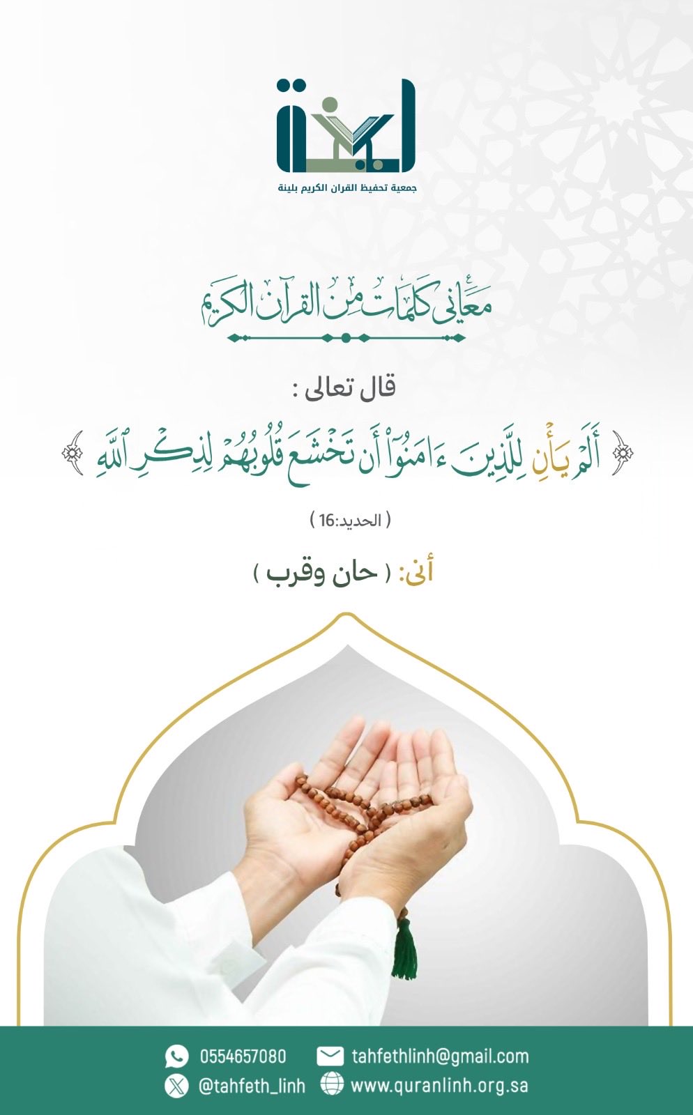 معاني كلمات من القران الكريم | معاني كلمات من #القران_الكريم – ﴿أَلَم #يَأنِ لِلَّذينَ آمَنوا أَن تَخشَعَ قُلوبُهُم لِذِكرِ اللَّهِ﴾ [الحديد: ١٦] أنى / حان وقرب #جمعية_تحفيظ_القران_الكريم_بلينة quran linh